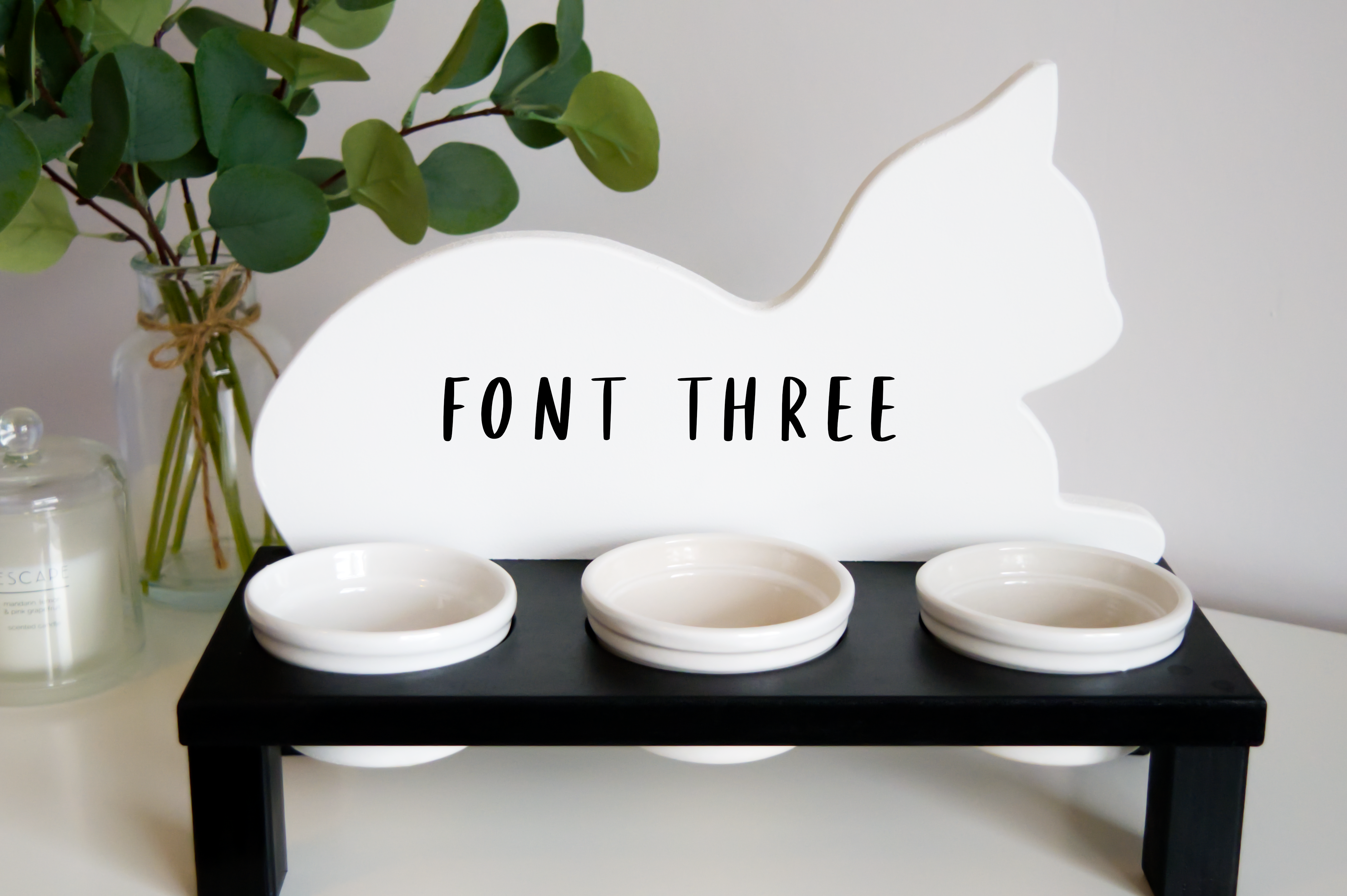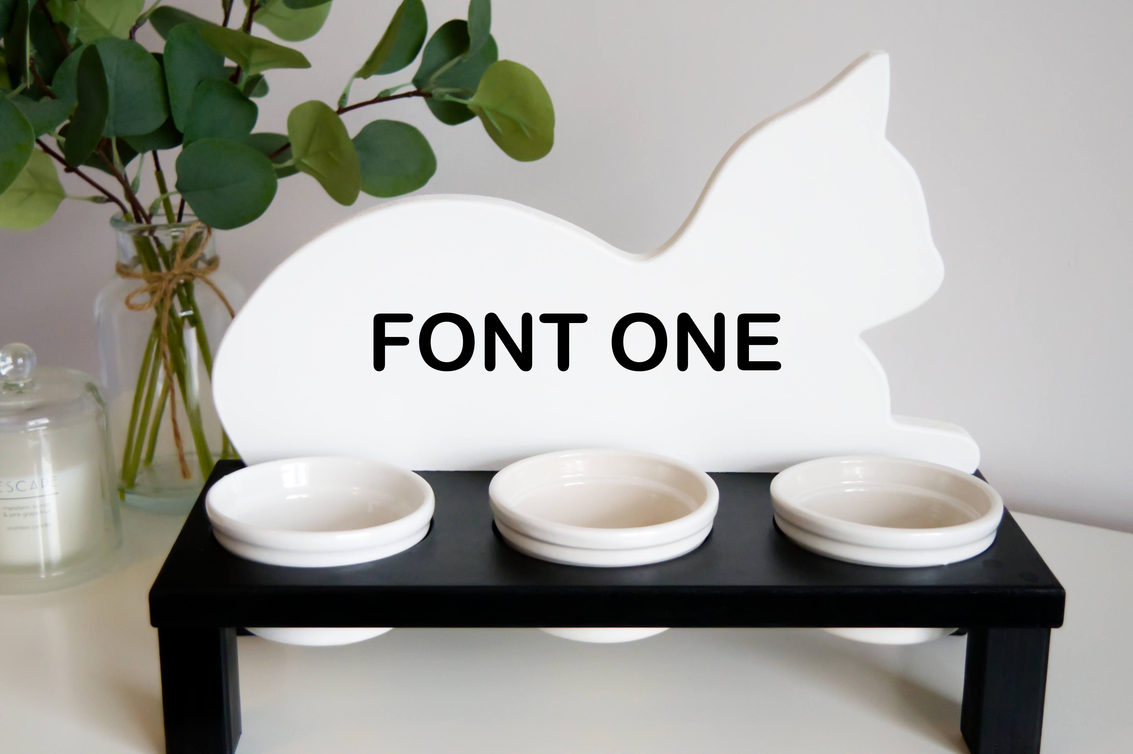 Our personalised cat feeding stands care our own unique design. They come personalised with the cats name on the back (or two names) and include three porcelain bowls. These are available in grey or black just like our personalised dog feeding stands. Please enter the name of the cat(s) into the “Personalisation” field.