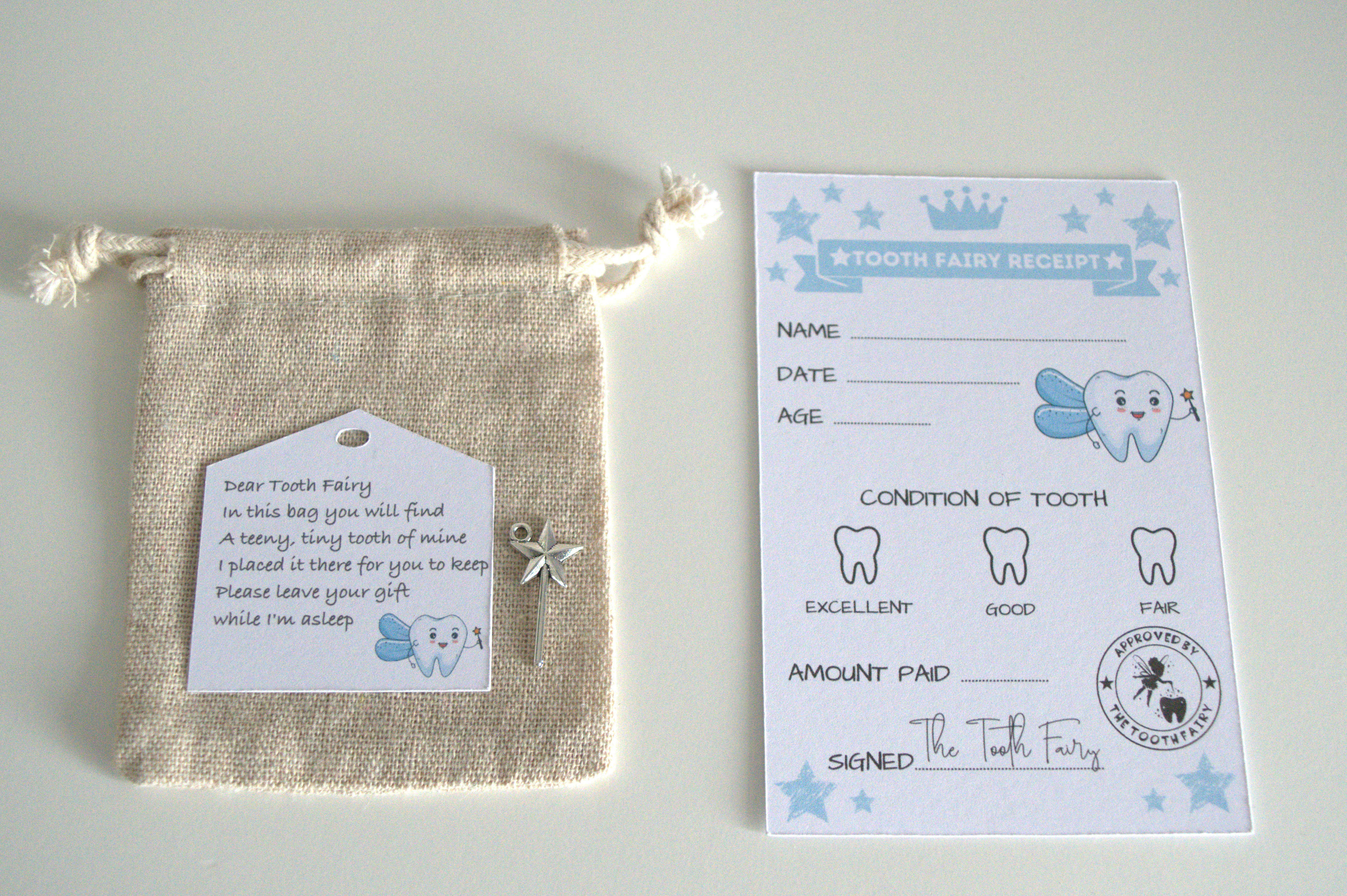Add a little more magic with our tooth fairy kits! They come with a personalised hessian bag, a tooth fairy wand charm, a poem card and two tooth receipt cards. They are available in blue or pink.